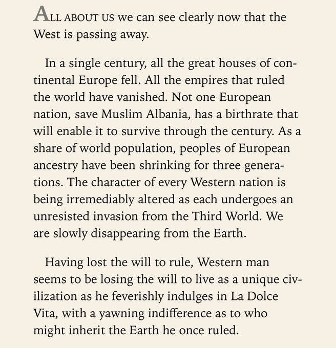 But what did that Good War truly achieve? In the words of Patrick J. Buchanan, whose reflection is shown above, the Second World War extinguished the last embers of Western ascendancy. All the great houses of continental Europe fell. The empires that once ruled the globe vanished. Birthrates collapsed. Peoples of European ancestry have been in demographic decline for generations. The spiritual confidence that once drove the West was replaced by exhaustion and disinheritance. The Allies may have won on the battlefield, but the civilization they claimed to defend did not survive the victory.